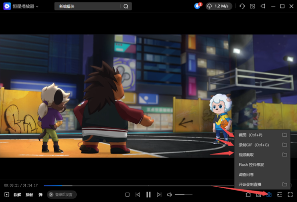 PC版恒星播放器拥有的第四个隐藏功能,就是在视频播放的时候,软件还可以截取对视频进行截图、截取部分内容以及录制GIF,这样更加方便了日常朋友们的视频内容的画面抓取需求。这个功能在视频内容播放的时候,在PC版恒星播放器界面底部右下角的【工具箱】中就可以找到。