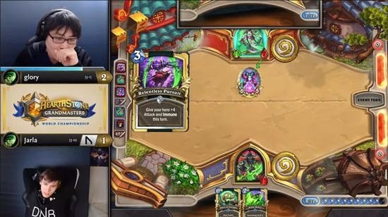 Jarla首发圣契圣骑士,以高质量的随从先声夺人拿下了第一局比赛。而glory则开始反击,先是使用奥秘潜行者造出了身材巨大的范克里夫和任务达人站场,平推龙牧师;随后又操刀暗月战士,凭借两只血骨傀儡赢下了对阵龙牧师的劣势对局,赢得赛点。最终,在残片恶魔猎手对阵吸血恶魔猎手的内战中,双方上演了一场打穿牌库的完美攻防博弈,最终glory更胜一筹,保证了血量的同时比Jarla更晚进入疲劳状态,逼迫机关算尽的Jarla投子认输。glory以3:1的比分向Jarla完成小组赛复仇的同时,也宣告了自己成功登顶2020,夺得特级大师赛全球总决赛的冠军!