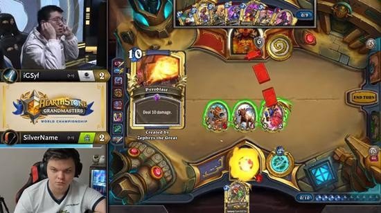 另一边iG.Syf在B组最终战中则对上了欧服选手SilverName,SilverName首发异变萨满,赢得开门红;但iG.Syf也不甘示弱,在宇宙猎人内战中凭借更佳的理解取胜,扳平比分,并更进一步在异变萨满对宇宙猎人的对局中早早拍下伊纳拉·碎雷,清空猎人全部的场面,拿到2个赛点;然而在第四局的炸弹战士内战中,SilverName准时拍下爆破之王砰砰终结了iG.Syf的连胜,而在最终炸弹战士对宇宙猎人的对局中,iG.Syf无法同时处理场面压力与维持血线,SilverName最终通过一发炎爆术终结了国服选手的最后希望。