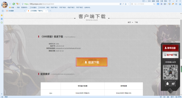 第三步,接着软件就进入到300英雄游戏的下载界面当中了,此时我们点击界面中间的【极速下载】按钮。