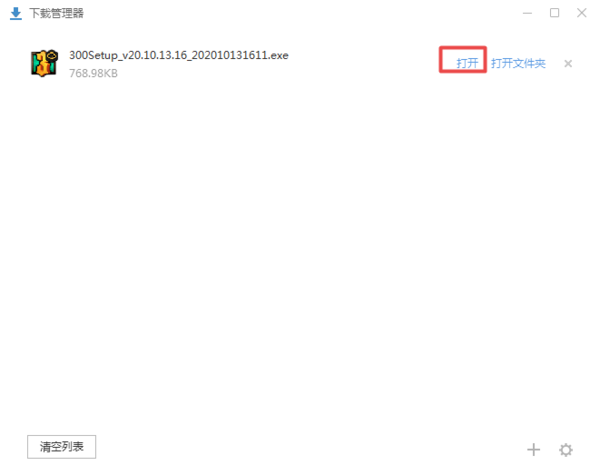第五步,接着浏览器就开始进行软件下载了,我们只需要稍等一会儿后,300英雄就下载成功了。下载成功后,我们点击【下载管理器】窗口中的,300英雄右侧的【打开】。