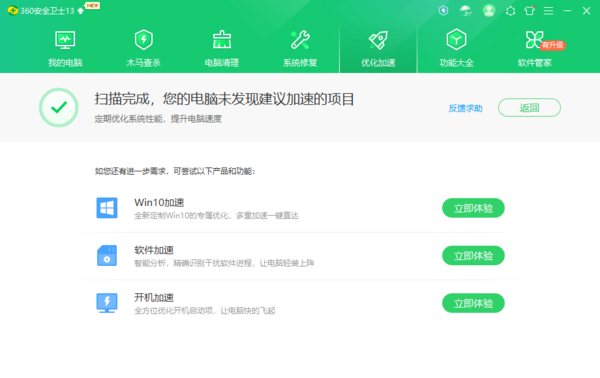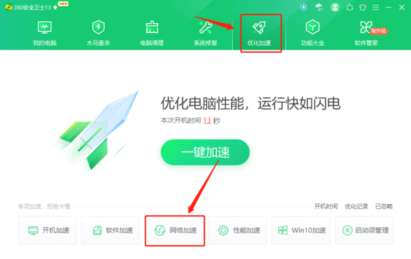 打开360安全卫士后,在上面的导航栏中点击“优化加速”,接着在底部找到“网络加速”,点击进入到加速详情界面。