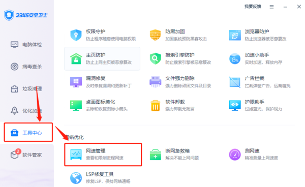 2345安全卫士中有一个网速监控功能,打开2345安全卫士后,在左侧的选项栏中点击“工具中心”,然后进入到软件功能列表中,在右侧选择“网速管理”。
