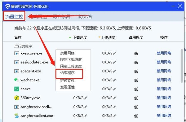 点击进入到网速管理详情页面后,在这里看到一些正在占用网络的程序软件,就可以知道哪些后台仍在启动的软件占用了网络资源。我们可以找到一些暂时不太需要的软件,并点击如图所示软件后面的一个下拉箭头按钮,然后在出现的三个选项中选择“结束进程”,关闭掉一些暂用不到的软件后网络也可以通畅很多。