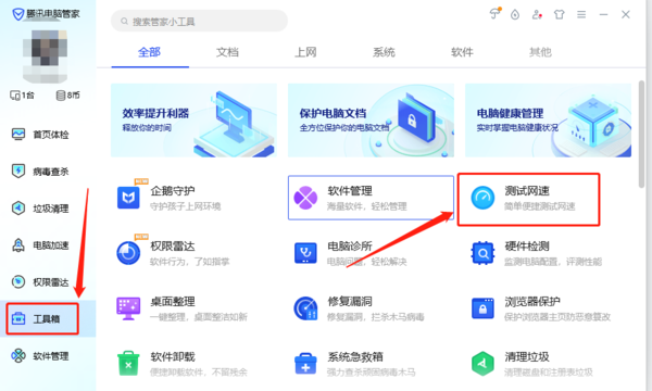打开电脑管家后,在“工具箱”中找到“测试网速”,在弹窗中点击“流量监控”一项,然后在这里找到暂不需要用的软件,对其右键并在菜单中单击“结束程序”将软件关闭就可以了。