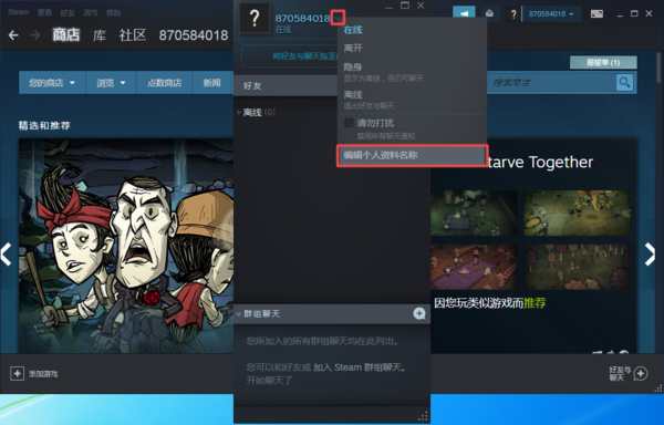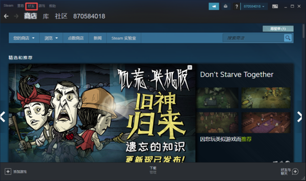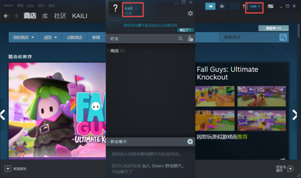第六步,回到steam软件的主界面和好友列表后,我们就可以看到,刚刚还是自己邮箱账号的名称此时已经成功的被修改成我们所想要的昵称了。
