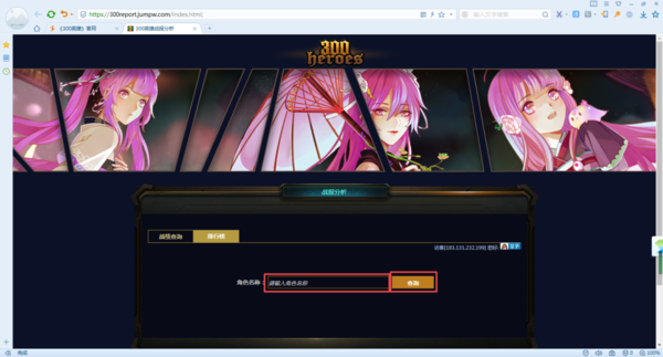 第四步,进入到300英雄的战报查询界面后,我们在界面上就可以【战绩查询】的功能了,在它的下方的输入框当中,输入你的【角色名称】,然后点击右侧的【查询】按钮,就可以查看300英雄的团分了。