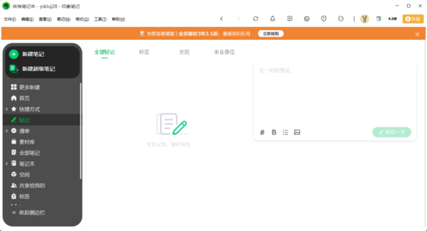 听名字大家就知道这是一款专门为编辑笔记而生的软件吧,在这里可以用现有的模板,对于自己日常的一些读书笔记、感想心得等一系列的碎片化信息都可以轻松记录下来。特别是印象笔记中的“轻记”功能对于平常一些喜欢随手记录的小伙伴来说非常的方便了,可以使用笔记本将多个笔记收集到一起,建立起自己的素材库。