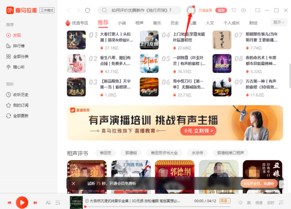首先,我们打开喜马拉雅,来到主界面;在主界面上方,我们可以看到【开通会员】按钮左边的头像,点击头像即可进入喜马拉雅登录界面。
