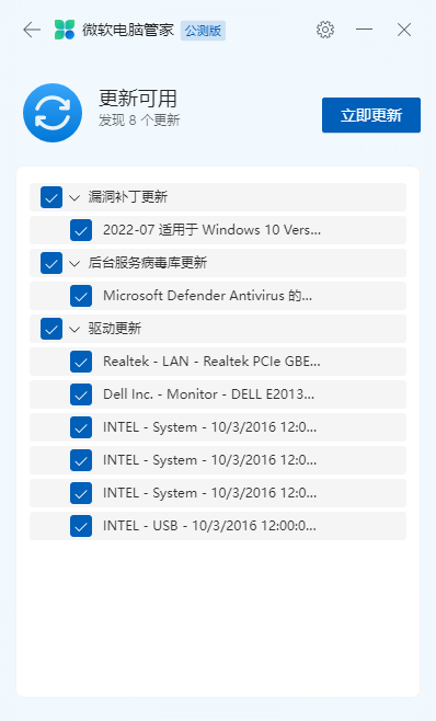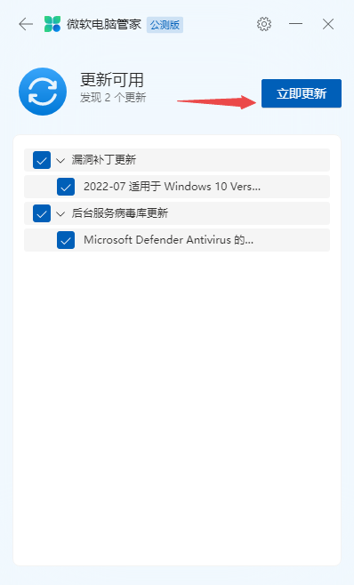 3、最后,微软电脑管家就会帮我们检查出Windows系统是否有可用的更新,如果有的话,会进行显示,然后大家进行相关选项的勾选,最后点击【立即更新】按钮即可。