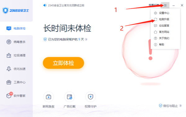 首先,我们打开2345安全卫士,来到界面。然后点击UI右上角的【三道杠】按钮,将扩展功能显示出来;接着我们点击【检测升级】,进入2345安全卫士检查升级界面。