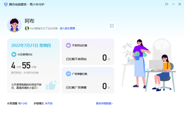 根据小编在网上搜集到的资料来看,能够远程监控孩子上网的电脑防护软件是腾讯电脑管家,因为这款电脑防护软件具备青少年守护功能,我们只需要在孩子使用的电脑上开启这个功能,家长就可以在手机上远程监控孩子的上网状态、时长,同时还可以为孩子的电脑开启防蓝光保护,定时提醒孩子休息,一边监控的同时,也可以一边守护孩子。