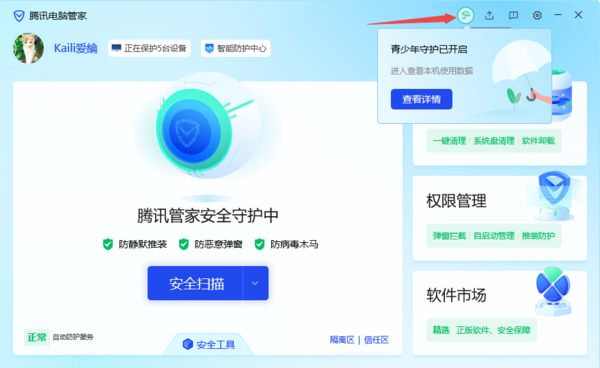 1、启动电脑上的腾讯电脑管家,然后点击小雨伞的【青少年守护】功能图标,接着勾选同意相关使用协议,然后点击【扫码开启】按钮。