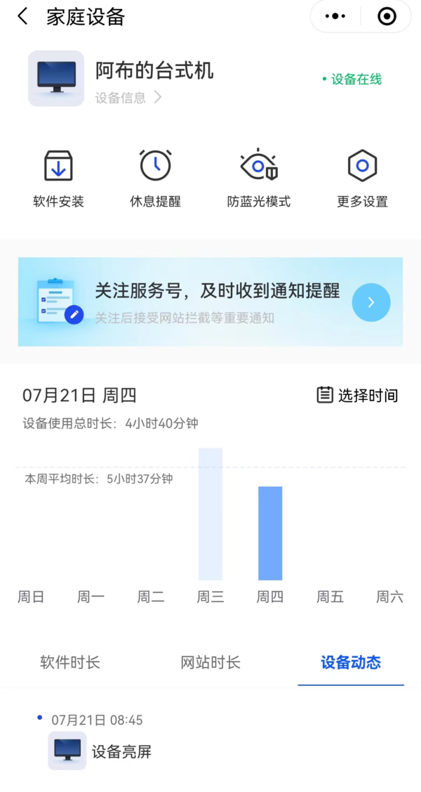 3、同时在手机端的界面中,家长不仅可以看到孩子使用电脑当前的状态,相关软件的使用时长,网站的访问时长,同时还可以为孩子使用的电脑开启屏幕防蓝光保护功能,以及提醒孩子在使用电脑时的休息提醒,监控保护二合一,家长更放心。