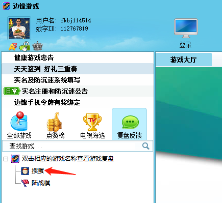 1、我们打开边锋游戏大厅,在游戏大厅左侧,游戏菜单的上方可以看到【复盘反馈】按钮,点击后即可跳转到边锋游戏大厅复盘界面。