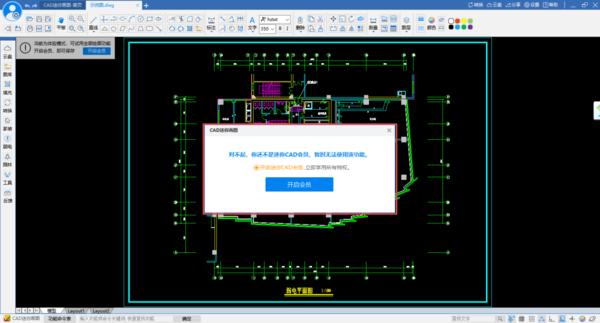 四、如果你还不是软件的会员的话,软件会提示【对不起,你还不是迷你CAD会员,暂时无法使用该功能】,然后有一个【开启会员】的按钮,点击它。