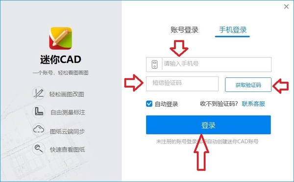 3、最后,输入自己的手机号码,点击【获取验证码】按钮,然后输入手机号接收到的验证码,最后点击【登录】按钮,便可以快速而又便捷地登录到CAD迷你画图这款CAD制图软件当中了。