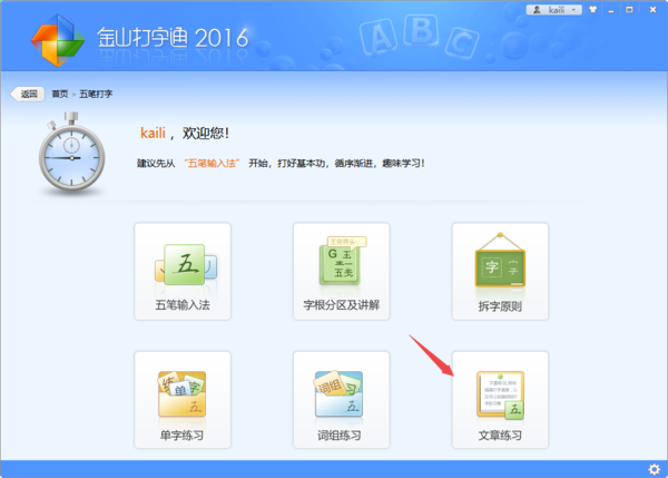 6、然后,在五笔打字界面中,选择【文章练习】功能。当然了,你也可以根据自己的实际情况,来选择相应的功能。