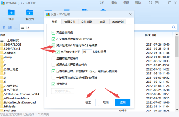 3、接着,软件就会弹出设置窗口了,我们在默认的【常规】设置界面中,找到【打开压缩文件时进行360木马扫描】的选项,并勾选它,下方的【当压缩文件小于10MB时进行】的选项也进行勾选,最后依次点击【应用】和【确定】按钮就可以了。
