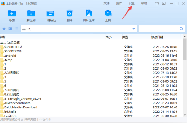 1、在电脑上安装最新版本的360压缩软件,软件安装成功后,双击启动它,接着在软件的主界面的顶部,找到【设置】功能,并点击它。