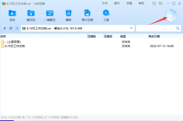 4、紧接着,我们通过360压缩来打开一个压缩包文件,然后在软件界面顶部的右上角位置,会有一个【扫描】图标,它就是木马扫描的按钮,点击它。