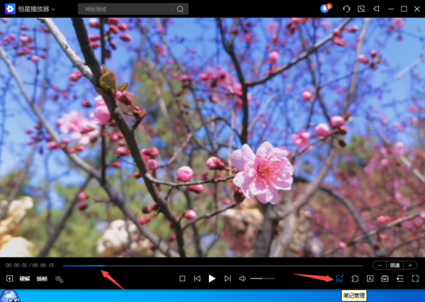 2、然后,在视频播放的进度条上,点击到想要添加笔记的位置上,接着再点击软件界面右下角的【笔记管理】图标。