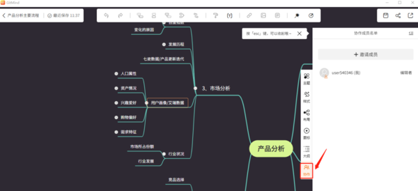 爱莫脑图中,编辑好了脑图之后我们就可以找到“协作”功能,然后将制作好的脑图发送给他人,通过我们的分享就可以进入到这里面来一起编辑文件了。