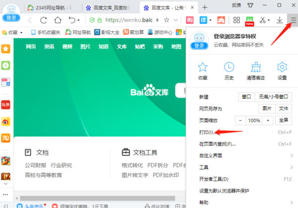 首先,我们打开2345加速浏览器,点击页面UI右上角的【菜单】,在扩展菜单中我们就可以找到【打印】,点击该按钮即可进入到2345加速浏览器的打印页面,以进行对该网页的打印设置。