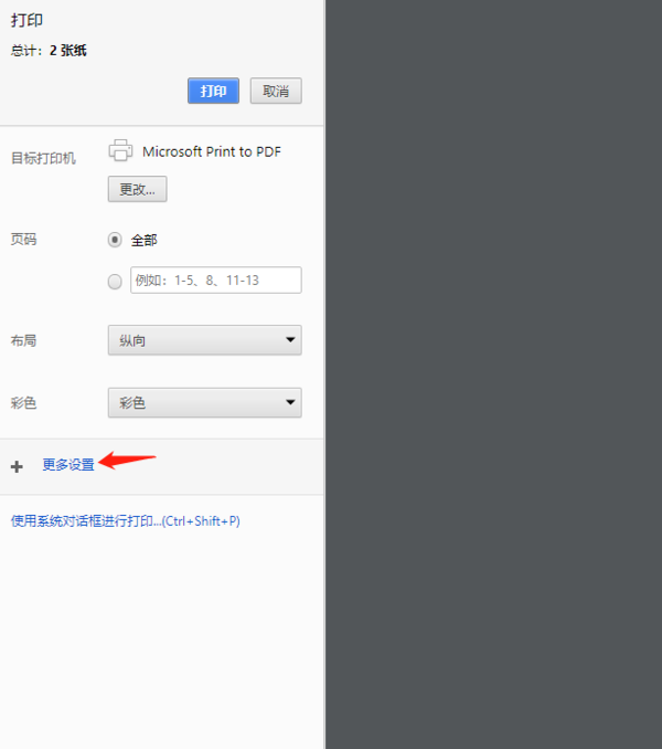 当我们位处2345加速浏览器的打印页面时,如果此刻的我们发现打印预览和我们想象的不是一回事,那么我们可以先点击【更多设置】,将完整的设置展开。