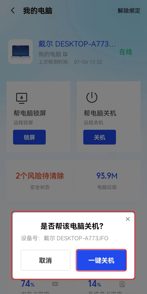 7.?进入到设备的详情界面当中,我们便可以看到【帮电脑关机】的功能了,点击它下方的【关机】按钮。