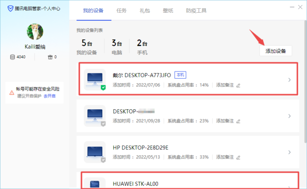 2.?接着登录到腾讯电脑管家当中后,软件会弹出个人中心界面,并默认会在【我的设备】界面进行显示。此时,我们可以看到腾讯电脑管家所管理的所有设备,包括电脑和手机,此时我们要确保要被远程关机的电脑设备和进行远程关机操作的手机设备都要在这个列表当中。设备不在该列表当中的话,点击【添加设备】按钮来进行添加。