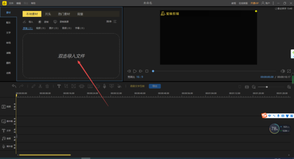 1、启动pc版蜜蜂剪辑软件,进入到软件的主界面当中后,在【双击导入文件】区域进行双击,然后将需要进行处理的视频文件添加进来。