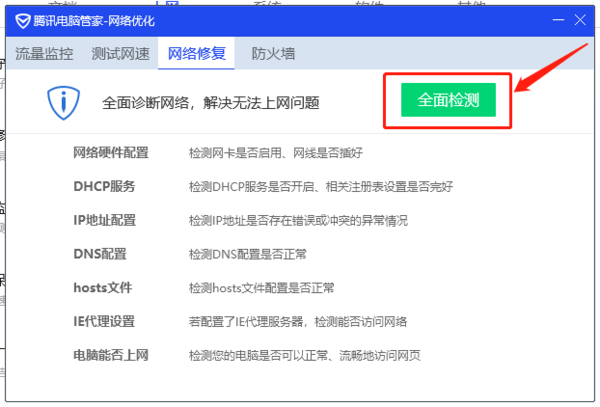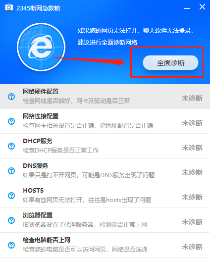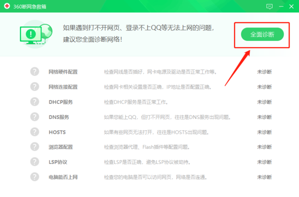 在之后出现的页面中点击“全面诊断”,待诊断结果出来后,根据问题进行修复就可以了。