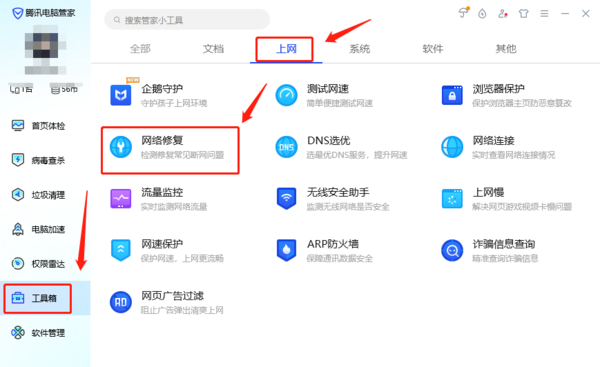 打开腾讯电脑管家之后,我们在左侧下方点击“工具箱”,接着在“上网”这一栏中找到“网络修复”。