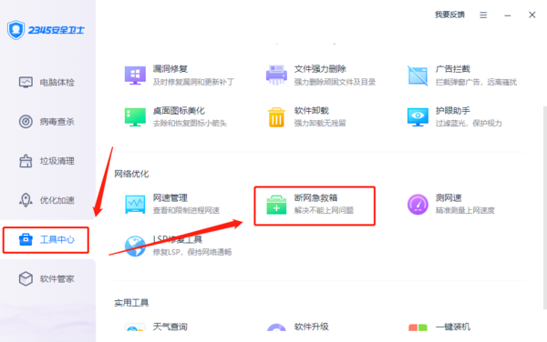 2345安全卫士中也是有断网修复的功能的,打开2345安全卫士之后我们在左侧下方点击“工具中心”,接着在右侧列表中找到“断网急救箱”并点击。