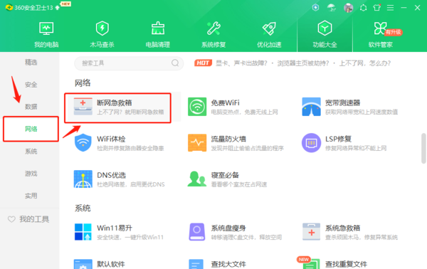 如果我们的电脑遇到了无法上网的情况,打开360安全卫士,在上方选择“功能大全”,进入到功能列表界面后,在左侧点击“网络”,然后在右侧的功能列表中选择“断网急救箱”。