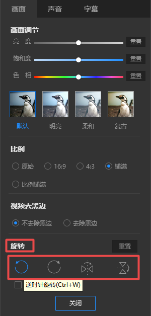3、然后软件就会弹出画面的设置窗口了,此时我们在这个窗口中,找到【旋转】选项,在这里我们就可以对播放视频的画面进行旋转调整了。而在【旋转】选项下方,共有四个旋转选项,包括【逆时针旋转】、【顺时针旋转】、【水平翻转】和【垂直翻转】四个选项,根据自己的实际需求来进行选择。