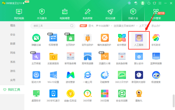 360安全卫士中也是有在线咨询功能的,打开360安全卫士,在顶部选择“功能大全”模块,然后在下面出现的一些功能中单击“人工服务”,在这里就找到电脑出现的问题然后向专业人士进行咨询。