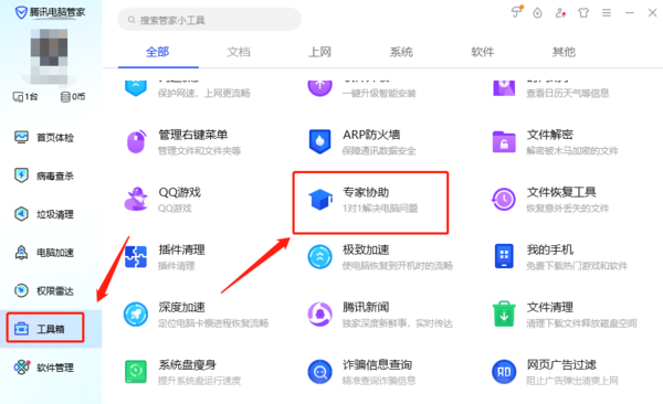 打开电脑管家后,在左侧的工具栏中找到“工具箱”,然后再右侧的功能界面列表中点击“专家协助”,在这里就可以和相关电脑专家进行一对一的问题分析解决了。