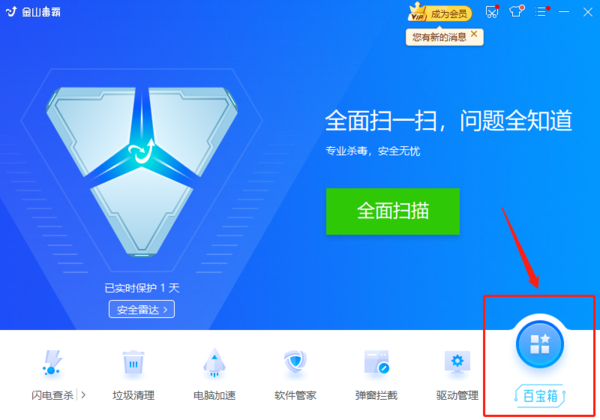 金山毒霸的工具箱似乎不像其它安全软件的工具大全界面那样好找,小编来告诉大家,打开金山毒霸后点击右下角的“百宝箱”就可以找到更多的功能了。然后在百宝箱中,找到并点击“电脑医生”。