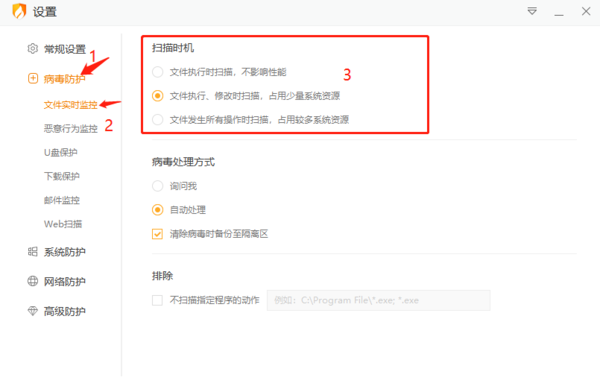 至于火绒安全软件的多模式切换入口,并非像上述两者一样方便,但也是有的。当我们进入设置界面,点击左侧【病毒防护】→【文件实时监控】,可对扫描时机的模式进行切换,以达到性能优先/防护优先的效果。