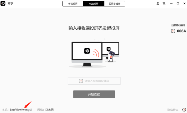 首先,我们在电脑中打开幕享,然后确认自己连接的网络,以及在幕享中显示的“本机名称”,以保证之后确认手机是否和电脑连接同一网络,而名称则是让我们后续投屏能找到自己的电脑。