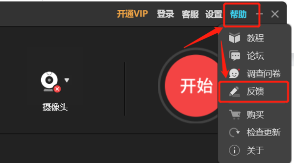首先在傲软录屏的主界面右上角找到“帮助”,然后在出现的下拉菜单中找到并点击“反馈”。