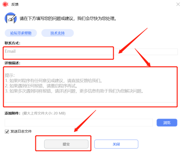 这时候会出现一个问题反馈的界面,在这个窗口中输入联系用的邮箱,并输入遇到的问题,如果需要相关附加的说明再上传一些附件文件,最后点击下面的“提交”就可以将问题反馈上去了。等待官方反馈解决方法,就完成了。