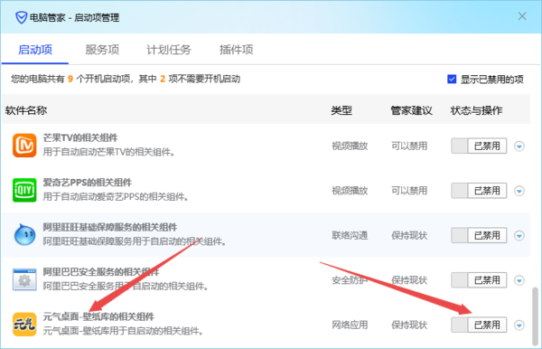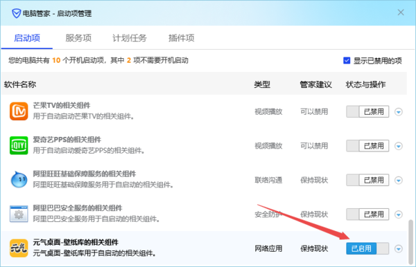 然后,在弹出的启动项管理窗口中,找到元气桌面壁纸相关的启动项,然后滑动其右侧的显示为【已禁用】的开关。