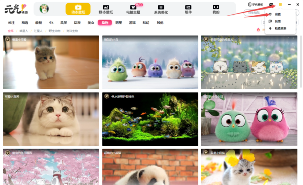 首先,启动电脑上的元气桌面壁纸软件,然后点击软件顶部右上角的【三】图标,然后在弹出的选项中点击选择【设置】功能。
