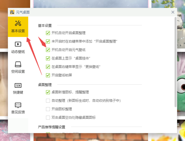 然后,在弹出的设置窗口里,点击界面左侧列表中的【基本设置】选项,接着在右侧的界面中,最后找到【开机自动开启元气桌面壁纸】功能并进行勾选即可。