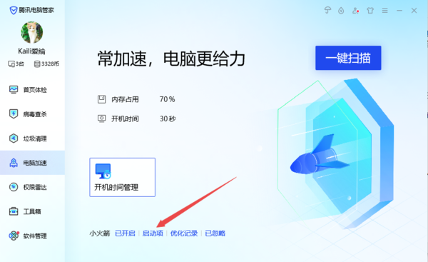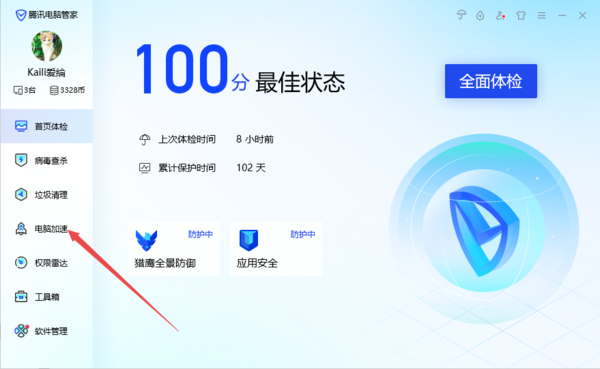 首先,打开电脑上的腾讯电脑管家或其他电脑防护软件,本文以腾讯电脑管家的操作过程为例进行介绍,然后在左侧的列表选择【电脑加速】功能。