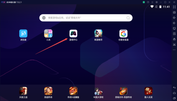 1、启动PC端的夜神模拟器软件,进入到软件的主界面中,找到【游戏中心】功能,并点击它。