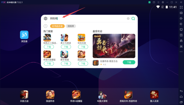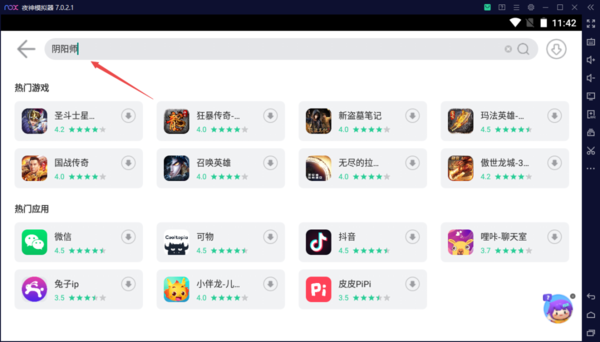 3、当然了,我们也可以直接在夜神模拟器软件的主界面顶部,在【搜索游戏&应用】的输入框中,输入【阴阳师】,然后进行回车搜索。
